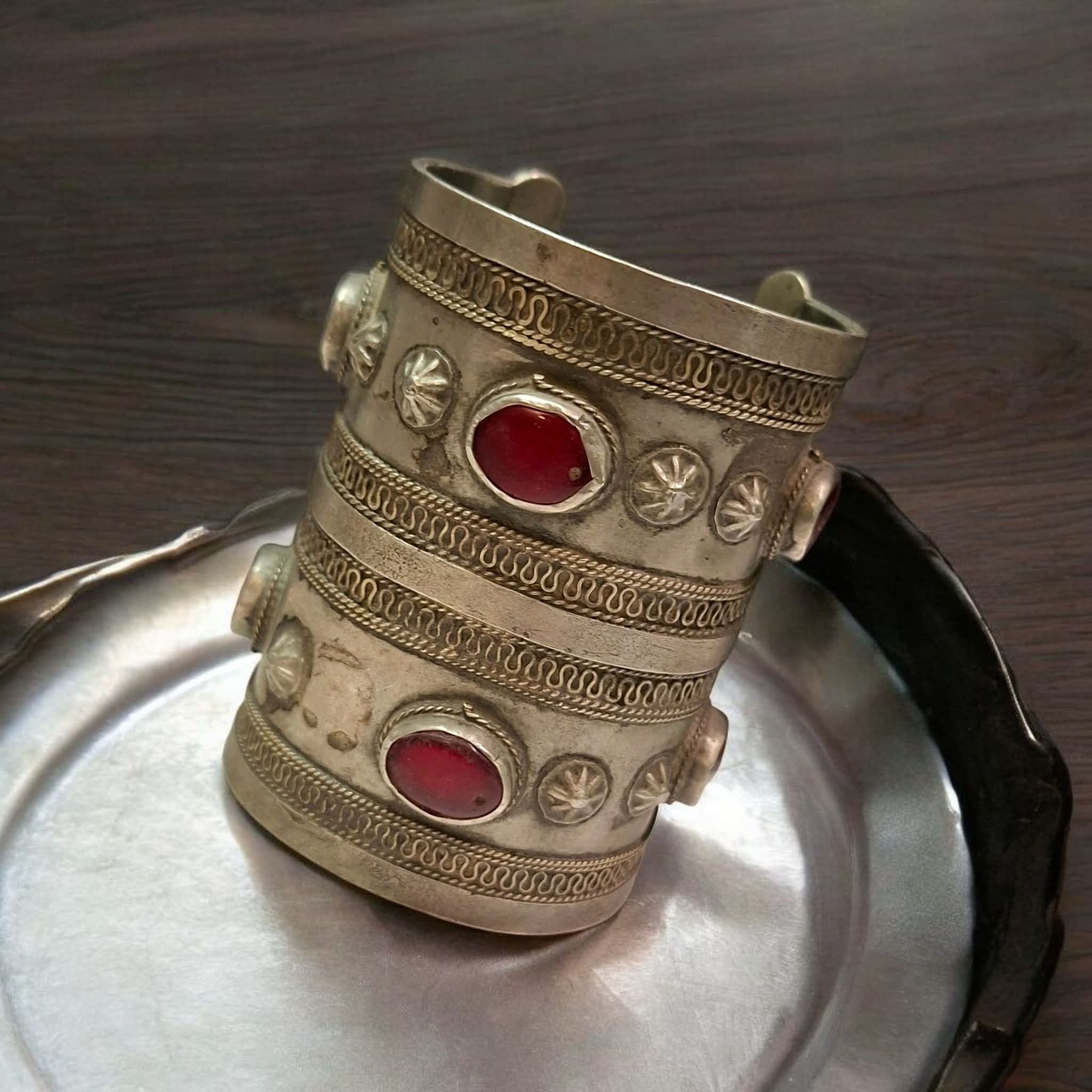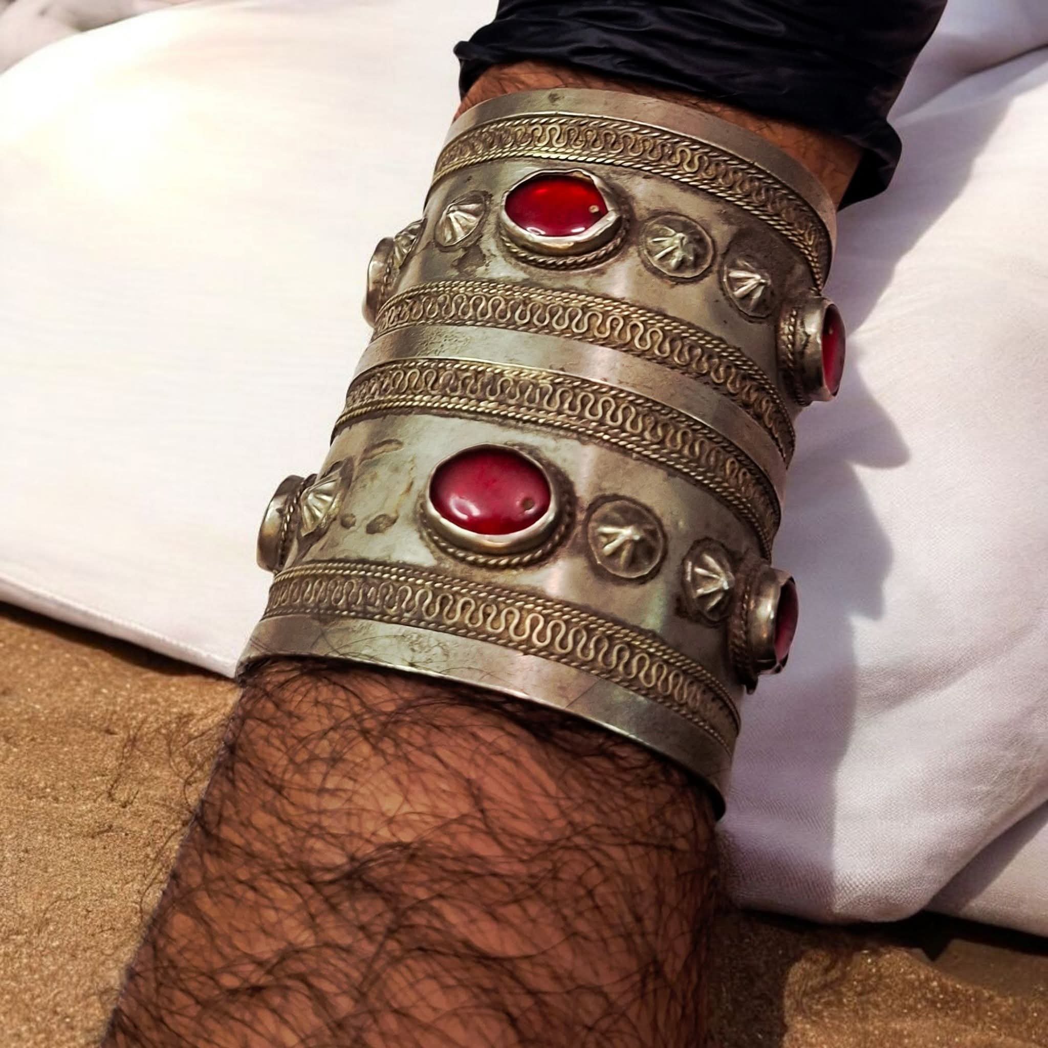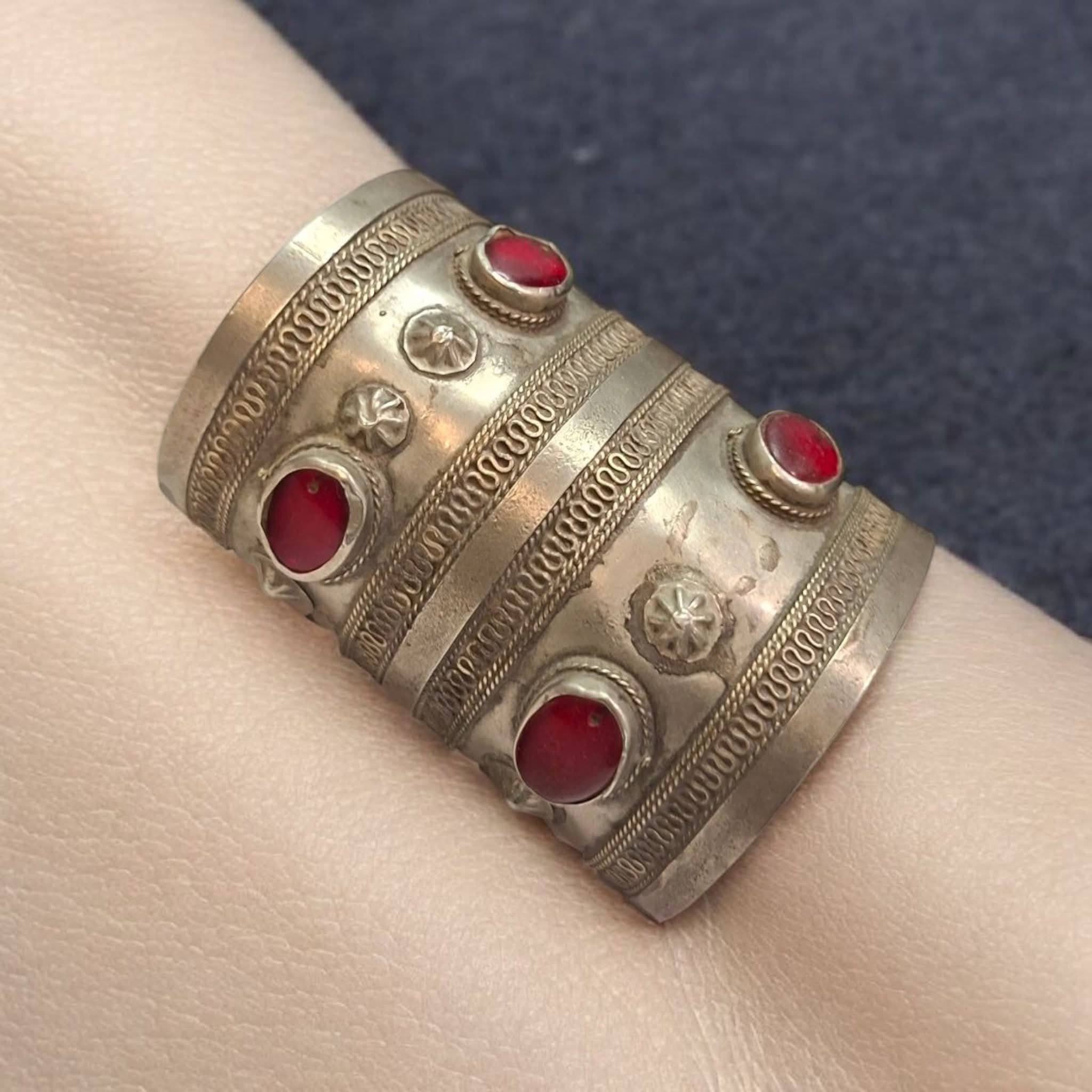 Discover the timeless beauty of tribal craftsmanship with this authentic Afghan Kuchi cuff bracelet. Handcrafted with intricate details and featuring vibrant red stone inlays, this substantial piece reflects the rich cultural heritage of the Kuchi nomads. A true statement accessory that brings a touch of nomadic elegance to any collection.