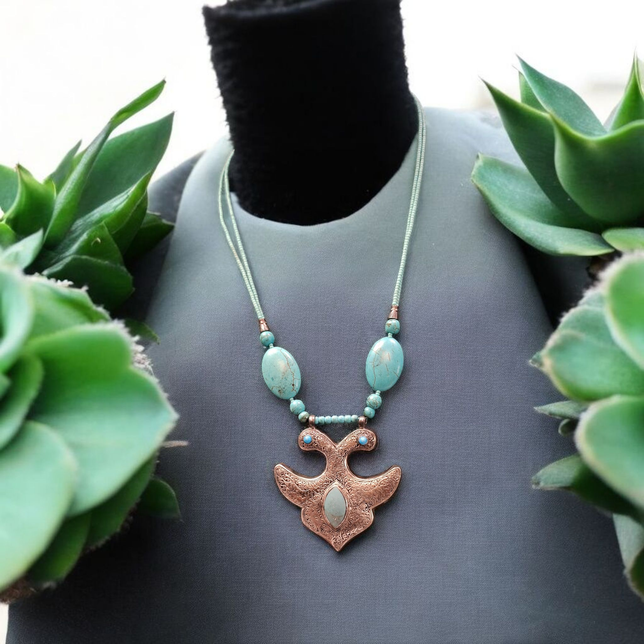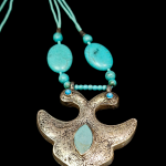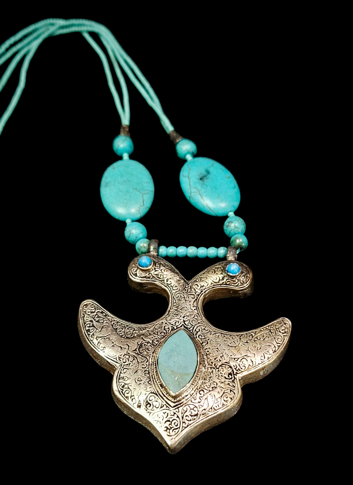 Make a statement with this beautiful Turquoise & Silver Tone Necklace. Features a unique, large etched metal pendant with a central turquoise stone. The necklace is strung with varying turquoise beads on a matching cord. Perfect for Southwestern, bohemian, country western, or tribal jewelry styles. A unique, artisan-inspired accessory for any collection.”