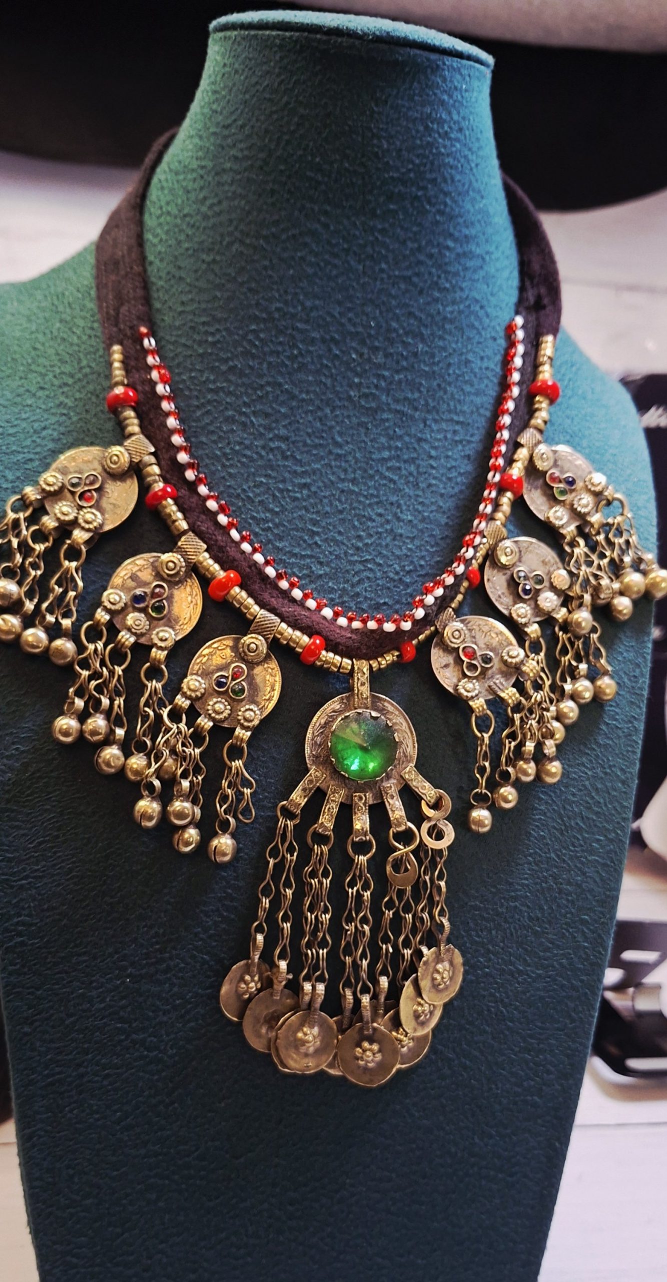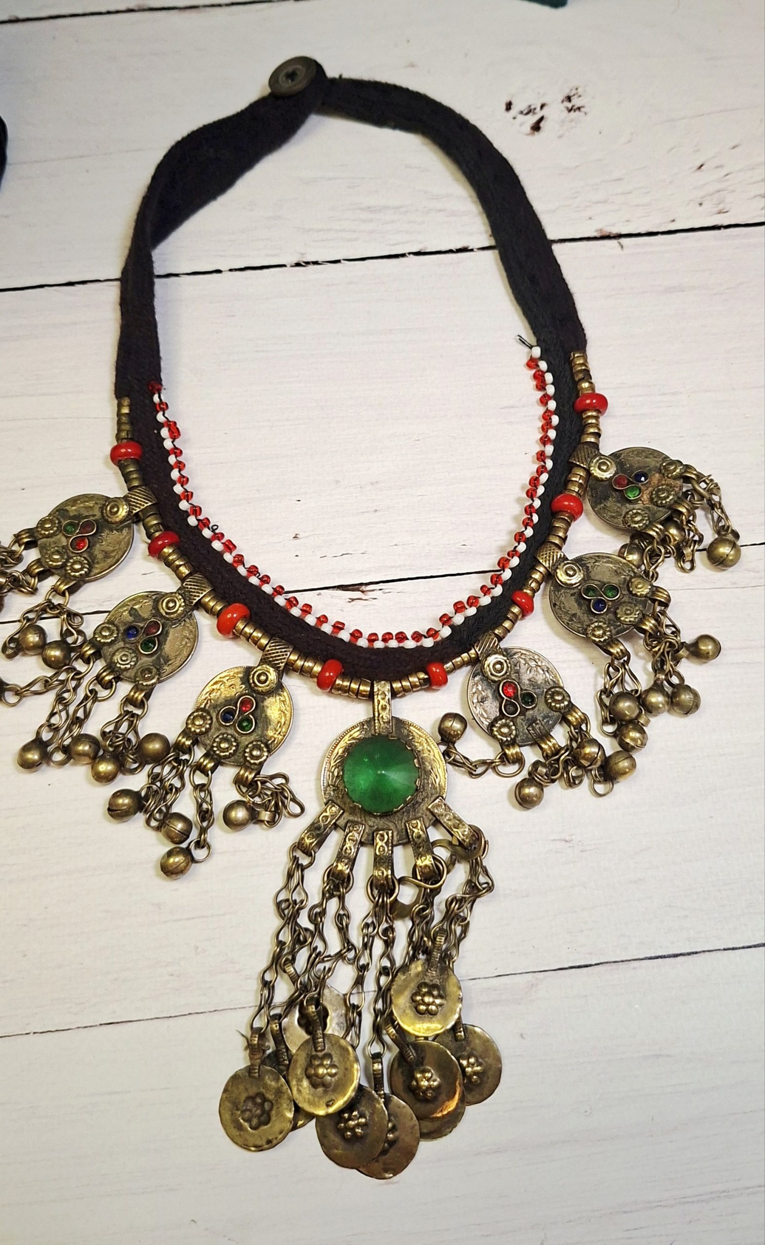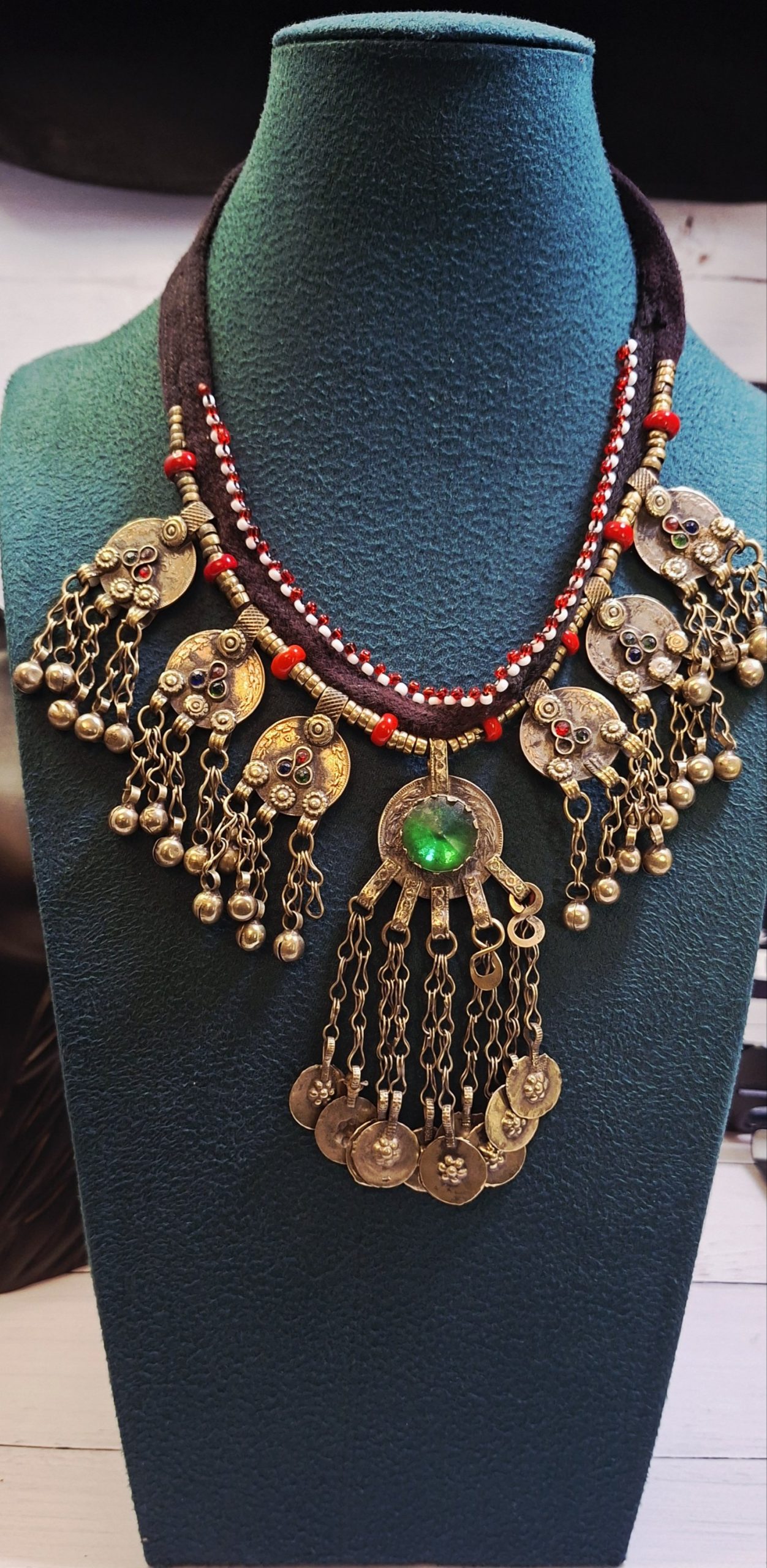 Discover the captivating beauty of our handcrafted tribal necklace. Featuring intricate metalwork, vibrant beads, and a striking green centerpiece, this unique piece adds a touch of bohemian elegance to any ensemble. Perfect for those who appreciate artisan craftsmanship and distinctive style.