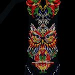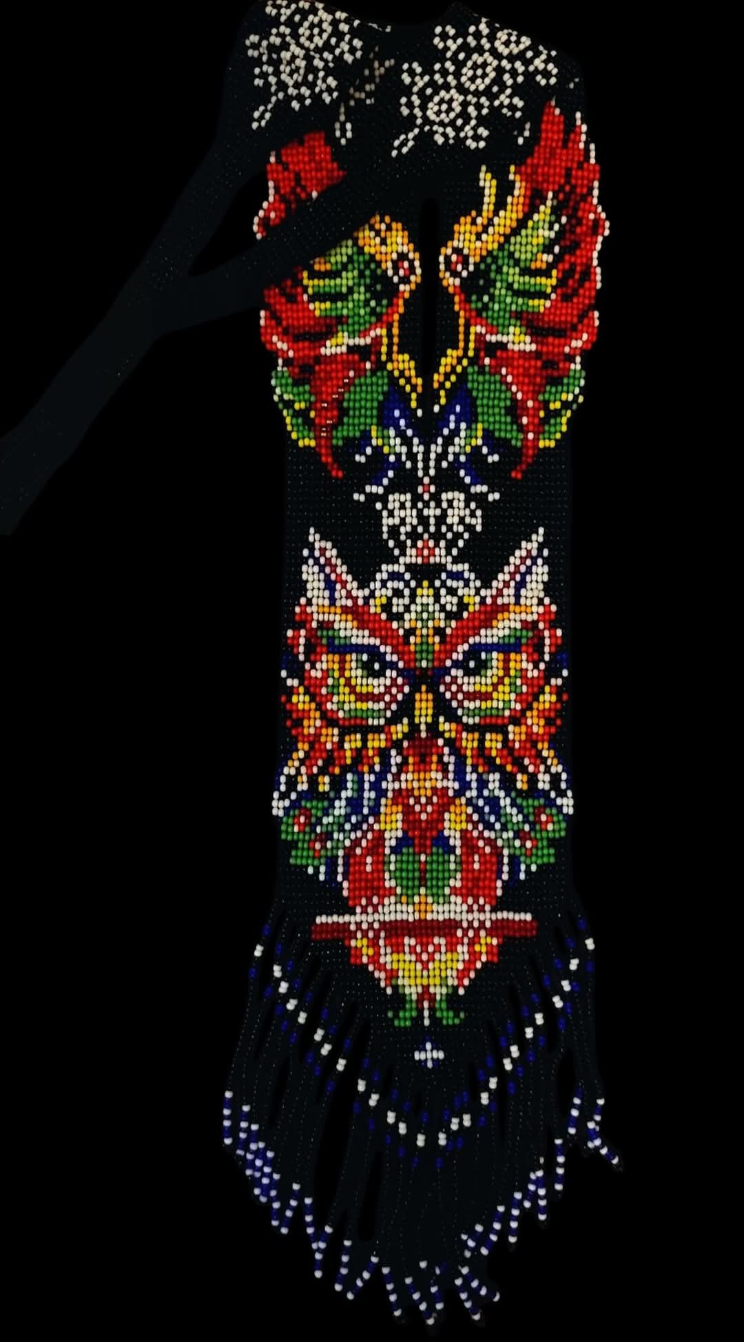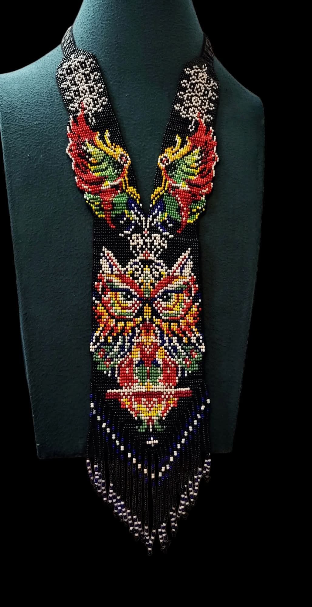This stunning necklace is a testament to the intricate artistry of the Huichol people, an indigenous group from central Mexico. Crafted entirely from tiny glass beads, it features a prominent, stylized owl design at its center, rendered in vibrant shades of red, yellow, green, and blue against a black background. The owl’s form is abstract yet recognizable, with large, expressive eyes and a detailed face.