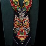 Flanking the central owl motif are symmetrical winged or floral elements, also richly adorned with colorful beads. The necklace tapers upwards to a broad, beaded band that would rest on the shoulders or décolletage, showcasing more intricate geometric patterns in white and black. The bottom of the necklace features a fringe of dangling beads, adding movement and a finishing touch to this elaborate piece.