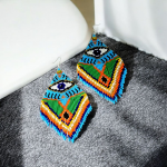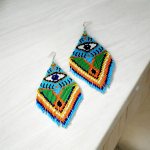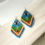 Discover our exquisite collection of handcrafted beaded fringe earrings, meticulously made with detailed brick stitch technique. Each pair, like these vibrant blue, green, and orange designs, is a testament to artisanal skill, offering a unique bohemian aesthetic. Elevate your look with these eye-catching and lightweight statement earrings.