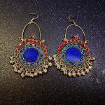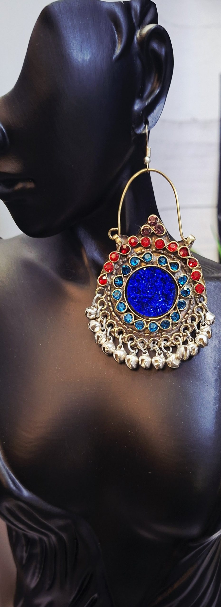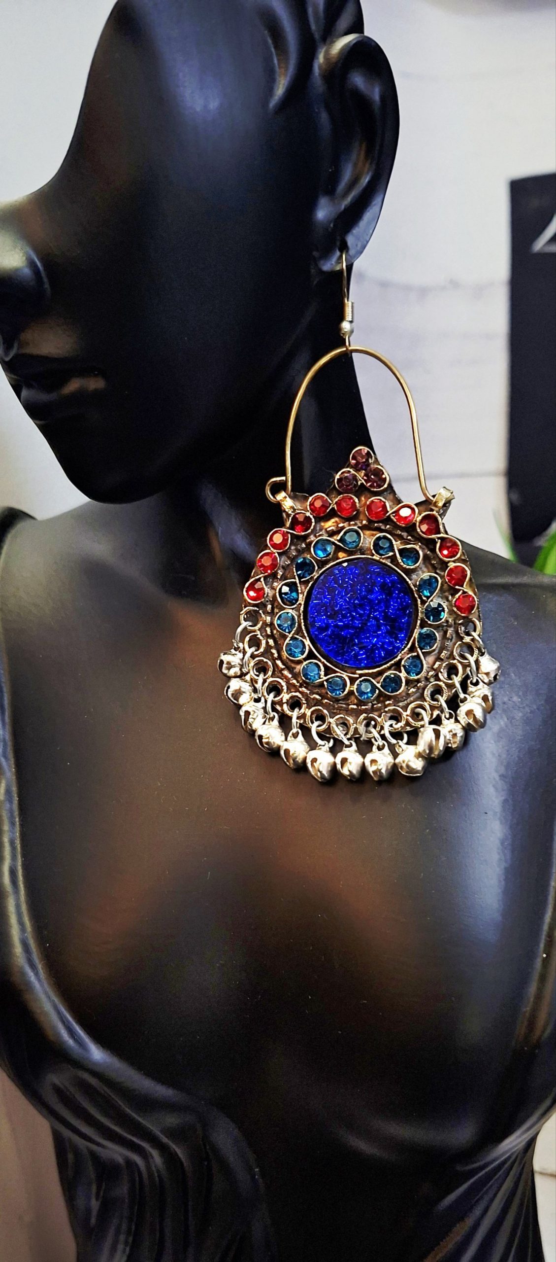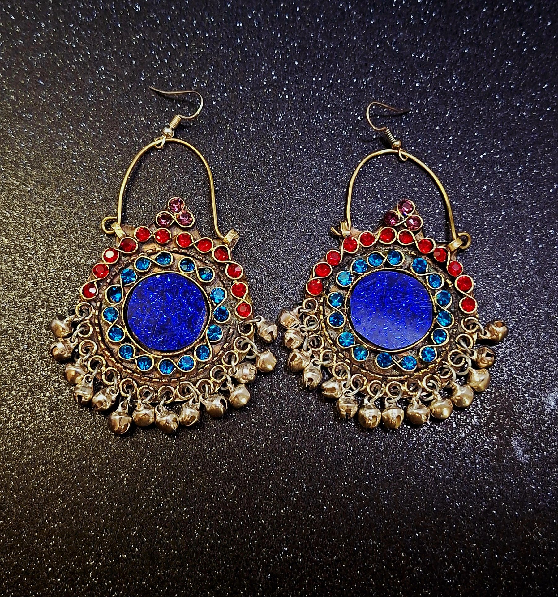 Embrace vibrant tradition with these stunning Kuchi-style earrings. Featuring a brilliant blue centerpiece surrounded by dazzling red and turquoise accents, and finished with delicate jingle bells, they add a touch of bohemian elegance to any look.