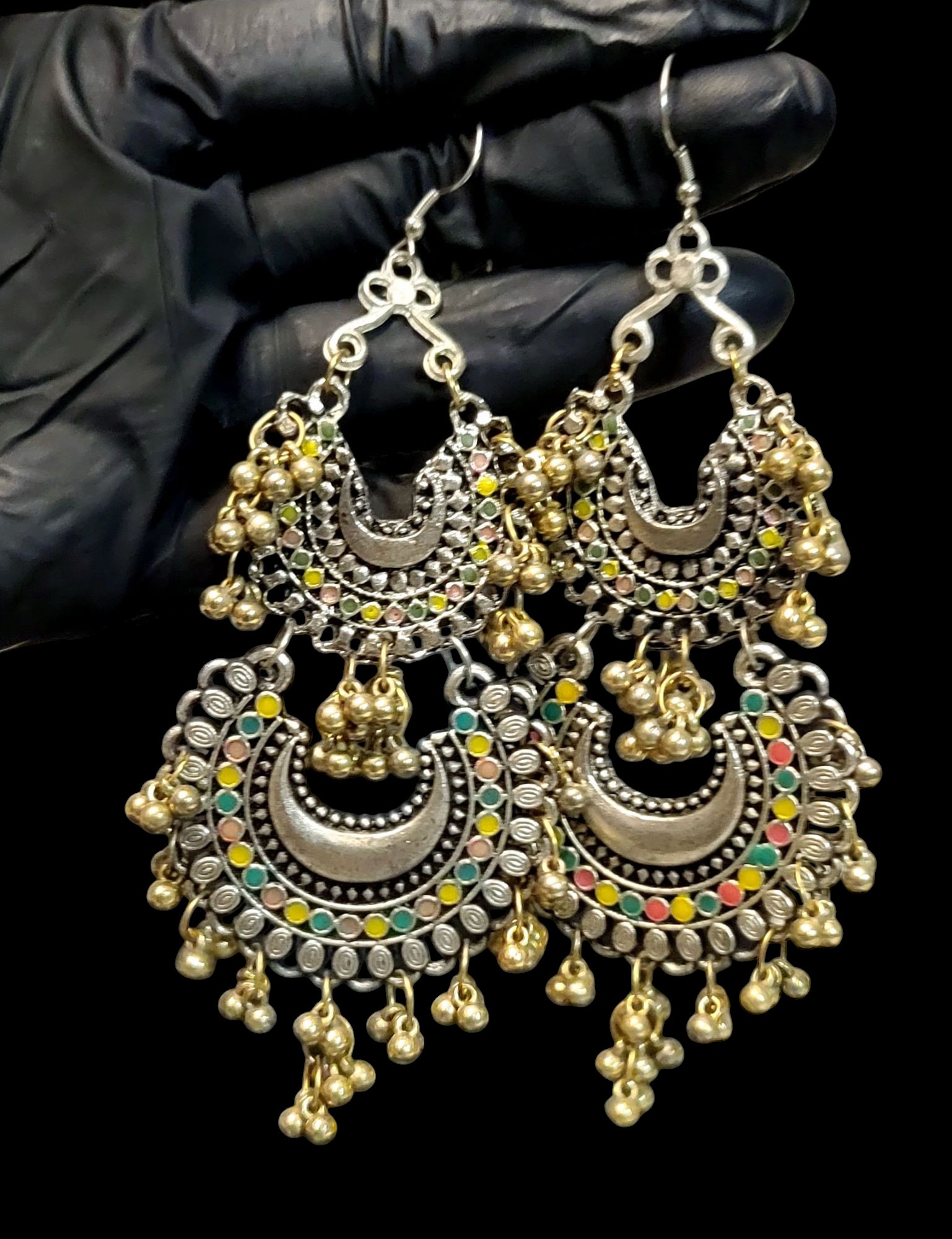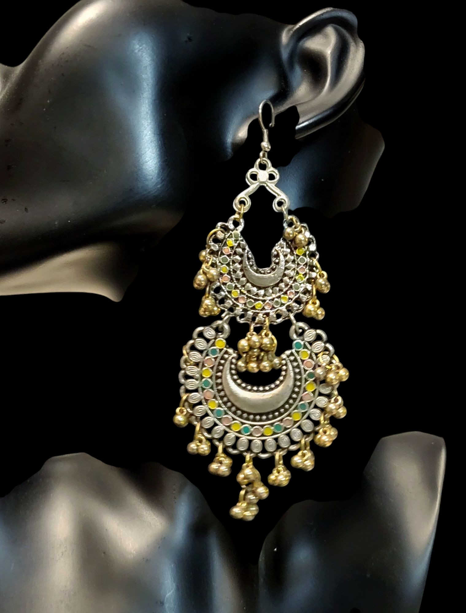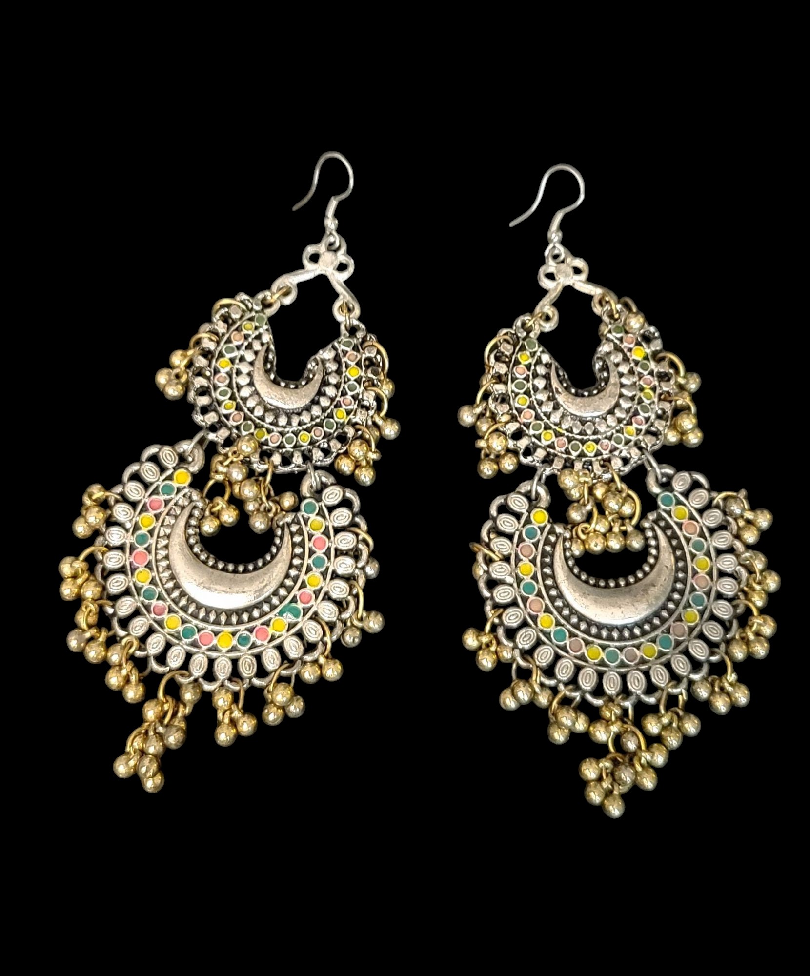 Add a touch of global flair to your look with these stunning, silver-tone chandbali earrings. Featuring a classic crescent moon shape adorned with intricate detailing and vibrant pops of color (red, yellow, green, and blue), these earrings are finished with delicate ghungroo bells that create a subtle, charming jingle. Perfect for adding a bohemian, ethnic, or festival vibe to any outfit. Lightweight and comfortable for all-day wear.