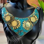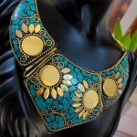 This stunning Tibetan style necklace combines vibrant shades of turquoise and gold to create an eye-catching statement piece. The chunky gold centrepieces are surrounded by an intricate mosaic of turquoise stones, exuding exotic charm and boho elegance. Perfect for adding character to any style.